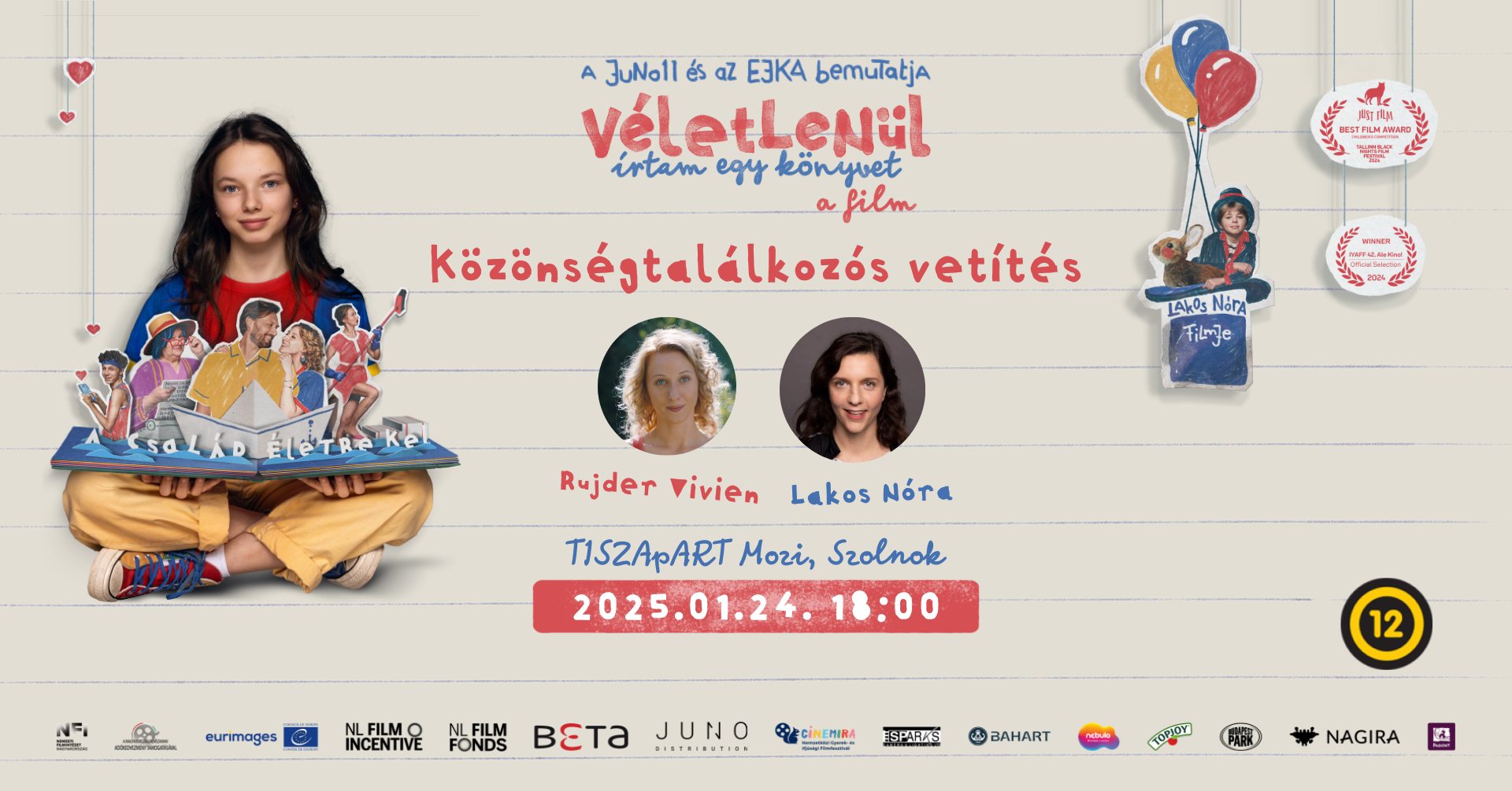 Szeretettel várjuk Önöket 2025. január 24-én 18:00 órától a Véletlenül írtam egy könyvet (12) című új magyar film közönségtalálkozójára. A vetítés után vendégeink lesznek a film alkotói Lakos Nóra rendező és Rujder Vivien színésznő.Véletlenül írtam egy könyvet (12) - magyar családi film, 101’ Rendező: Lakos NóraSzereplők: Mucsi Zoltán, Gryllus Dorka, Lovas Rozi, Rujder Vivien, Tenki Réka,Nina (Demeter Villő) legfőbb vágya, hogy író legyen – kreativitását animációsfilm-rendező apjától (Mátray László) örökölte. Mindennapjait kétbalkezes bűvész öccse (Hárs Bonca) kavarja fel, s mivel az anyukája (Lovas Rozi) korán meghalt, női mintaként kissé merev nagynénje (Tenki Réka) szolgál a családban. Amikor apja életébe egy új szerelem (Rujder Vivien) érkezik, Nina a szomszédban élő bohém írónő (Zsurzs Kati) iránymutatásait követve, az írás segítségével dolgozza fel édesanyja elvesztését és nyitja meg szívét az új családtag és az első szerelem (Kövécs Barnabás) előtt.