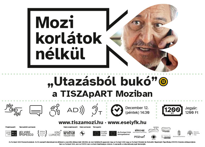 Mozi Korlátok Nélkül kedvezményesen a TISZApART Moziban, Szolnokon!December 12-én, pénteken 14:30-tól az Utazásból bukó című magyarul beszélő francia vígjátékot láthatják jelnyelvi tolmácsolással, felirattal és audionarrációval akadálymentesítve.Kedvezményes jegyár: 1200 Ft, bérlet 6 alkalomra: 6000 Ft/fő, csoportos jegy: 6000 Ft/6 fő!Összefoglaló:Ki nem álmodott még ingyen utazásról, ahol minden kulináris különlegességet grátisz megkóstolhat? Yann, egy fiatal párizsi futár éppen erről álmodik, számára a nyaralás az all inclusive üdülőhelyeket jelenti. Erre esélye nyílik, mikor ebédet szállít Karolnak, a Guide Du Routard főszerkesztőjének és egyben megszállott kalandornak. A világ legjobbnak tűnő állása egy utazási lapnál annyira felizgatja Yannt, hogy még füllenteni is hajlandó érte. Ám mikor Marrákesbe küldik dolgozni, ráébred a munka kihívásaira. A helyszínen bejárja a várost Sofia, egy temperamentumos marokkói idegenvezető segítségével. A fényűző riádok és sivatagi túrák nem várt bonyodalmakba fordulnak, amikor a fiatalok megpróbálnak megakadályozni egy műkincskereskedő akciót.Szeretettel várjuk Önöket!
